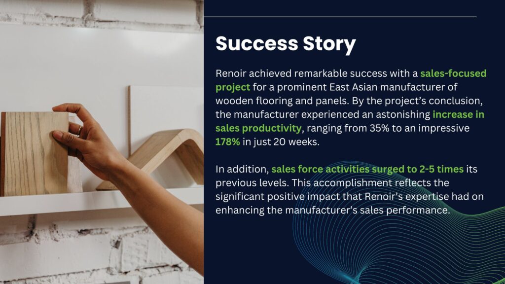 At Renoir, we have extensive experience in executing sales-focused projects with our clients. We understand the importance of increasing sales and margins, and we have successfully tackled diverse challenges, ranging from fast-moving consumer goods to large capital projects. Our expertise lies in deploying the best methodologies to achieve exponential revenue growth, including overcoming obstacles in the sales and marketing domain.